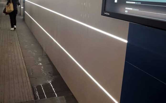 Secchi, stracci ed idropulitrice per raccogliere ed asciugare la pioggia che cade dalla copertura del soffitto. Alla stazione ferroviaria di Nocera Inferiore, a causa del maltempo, il passaggio verso la rampa d’uscita si presenta sempre pieno di pozzanghere per i passeggeri.