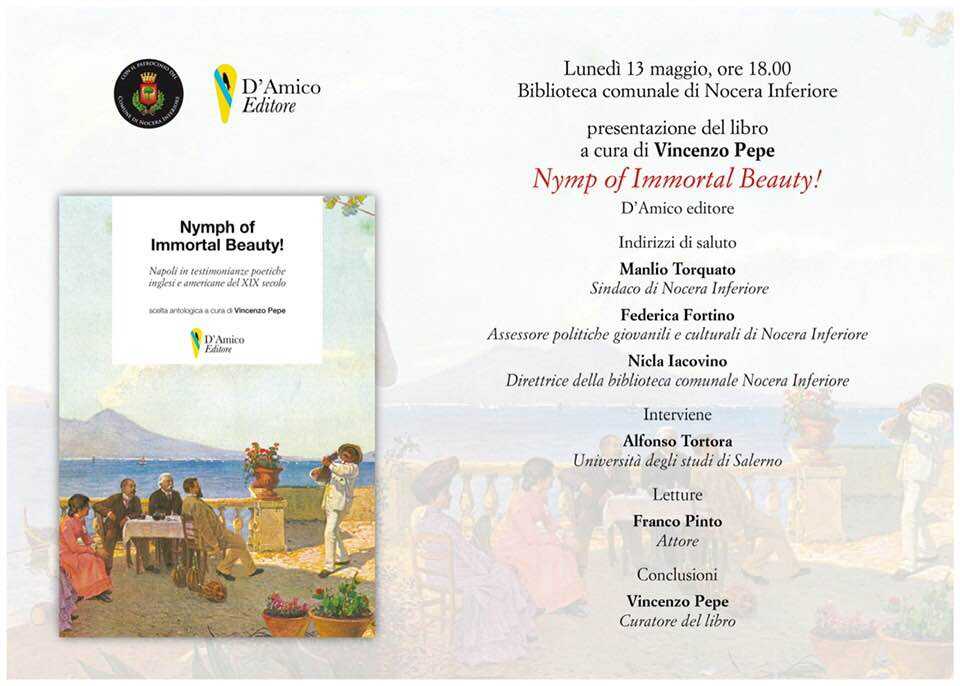 Oggi sarà presentato presso la biblioteca comunale di Nocera Inferiore il libro di Vincenzo Pepe: Nymph of immortal beauty. Appuntamento fissato per le ore 18.00. Il libro raccoglie testi poetici di scrittori romantici di lingua inglese che hanno trasmesso in versi la loro attrazione per Napoli e dintorni, Ninfa immortale.
