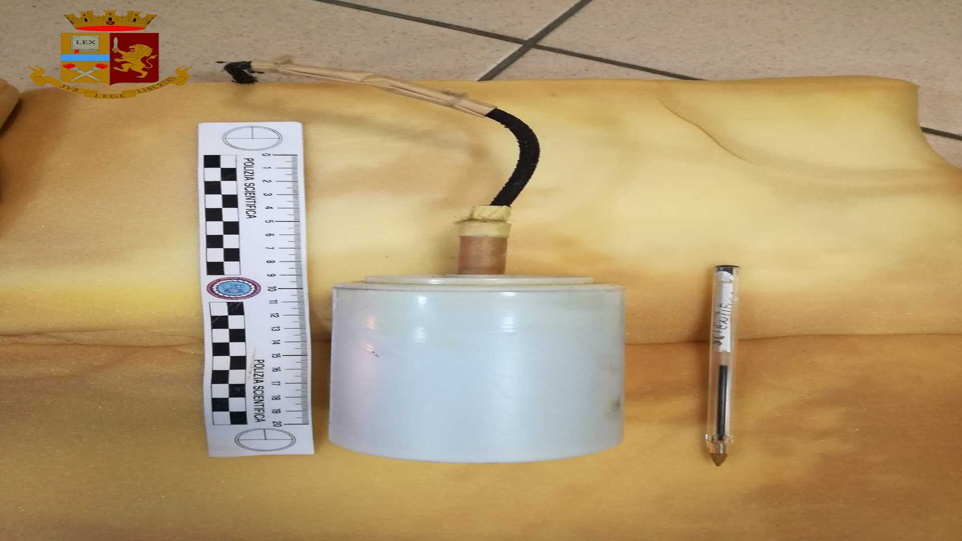 «Nel pomeriggio del 10 dicembre 2019, a Nocera Inferiore in Via Federici, personale del Commissariato di P.S. di Nocera Inferiore effettuava una perquisizione domiciliare presso l’abitazione di D.R. M. di anni 59, pregiudicato per reati specifici, al fine di rinvenire armi ed esplosivi ai sensi dell’art.41 T.U.L.P.S.La perquisizione veniva estesa ad un locale terraneo ubicato nella medesima via al civico 36, in uso al predetto. All’interno del piccolo locale di circa 6 mq., su un precario soppalco, veniva rinvenuto un ordigno esplosivo, di tipo micidiale, avvolto in fogli di spugna e occultato in una scatola di cartone.L’ordigno si presentava come un cilindro di materiale plastico di colore bianco, avente dimensioni 10 x 8 cm e peso complessivo di gr. 400, dotato di una miccia di colore nero lunga cm 25, con ritardo di cartone.Il personale della Polizia di Stato faceva evacuare la zona limitrofa al piccolo locale adottando le cautele necessarie, impedendo il transito di persone e veicoli e facendo intervenire sul posto l’artificiere anti sabotaggio della Polizia di Stato in servizio presso la Questura di Salerno. Dopo accurata analisi, l’artificiere della Polizia faceva rimuovere l’ordigno esplosivo affidandolo ad una ditta specializzata per la custodia in vista delle successive perizie tecniche, definendo l’ordigno rinvenuto, per le caratteristiche del suo confezionamento, dotato di una potenzialità lesiva con effetto micidiale e distruttivo. D. R. M. veniva tratto in arresto in quanto detentore di un ordigno esplosivo di tipo micidiale disciplinato dalla L. 895/67 in tema di controllo delle armi e degli esplosivi. Il Sost. Procuratore di turno presso la Procura della Repubblica di Nocera Inferiore, dr.ssa Federica LO CONTE, subito informata del rinvenimento e del successivo arresto, disponeva la traduzione del predetto presso il proprio domicilio in attesa dell’udienza di convalida. Sono in corso attive indagini, coordinate dalla Procura della Repubblica di Nocera Inferiore, per verificare la provenienza dell’ordigno sequestrato».