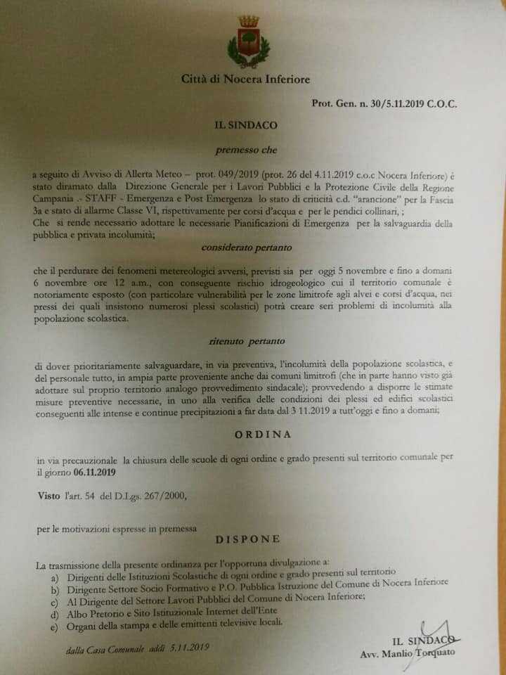 La criticità Meteo resta, pertanto il primo cittadino ha firmato l’ordinanza che tiene chiuse le scuole anche per la giornata di domani, 6 novembre.