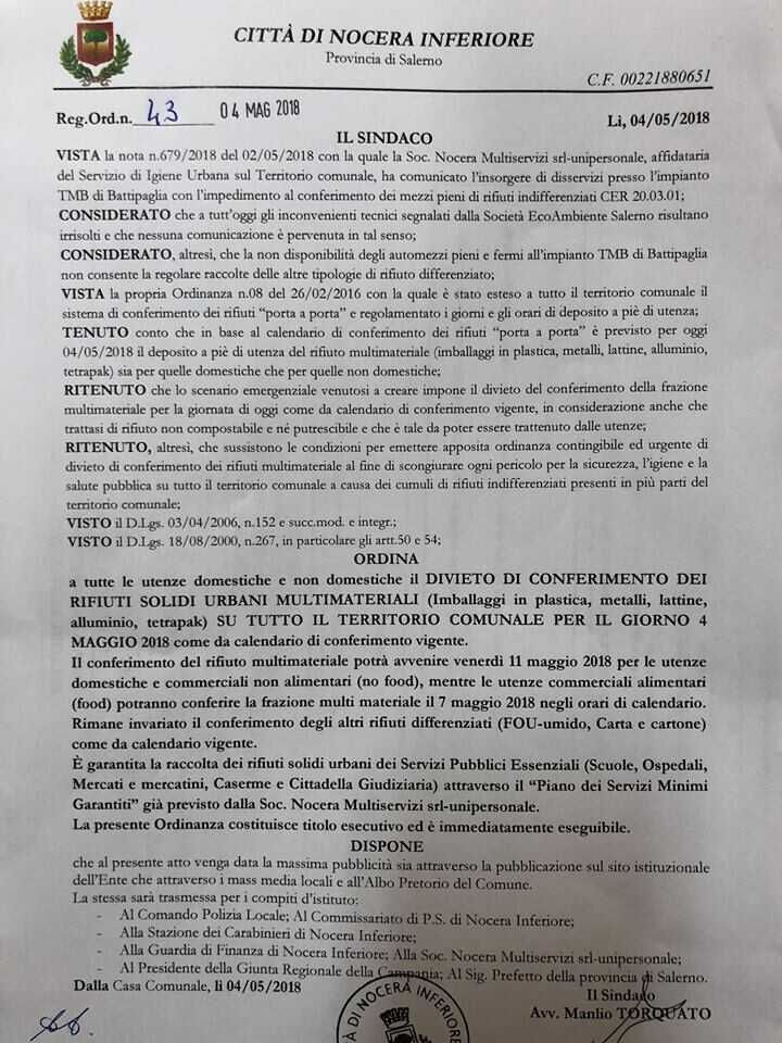 Divieto per questa sera: non si potranno conferire i rifiuti da calendario a causa del perdurare dei problemi al Tmn (ex Stir) di Battipaglia. L’amministrazione comunale ha chiesto la collaborazione a tutti i cittadini e agli esercenti commerciali.
