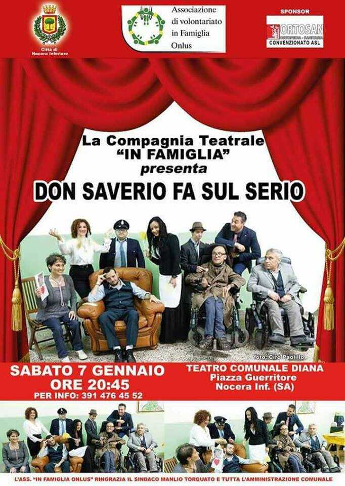 L’associazione di volontariato “In Famiglia onlus” metterà in scena domani sera, al teatro Diana di Nocera Inferiore, lo spettacolo dal titolo “Don Saverio fa sul serio”, una commedia divertente che pone anche in risalto problematiche che riguardano la disabilità.