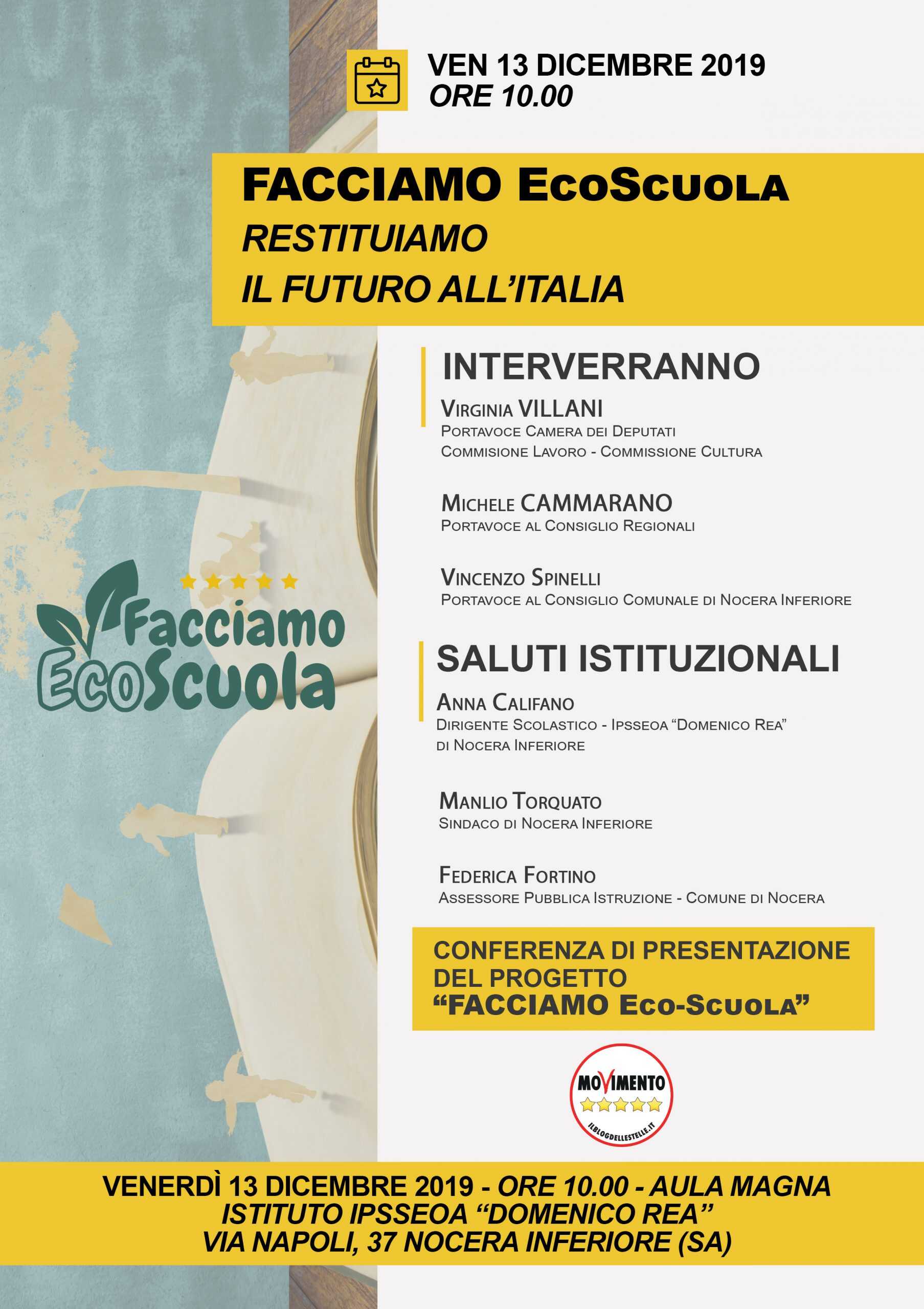 E’ partita la terza edizione di “Facciamo Scuola”, l’iniziativa promossa dai portavoce del Movimento 5 Stelle. L’iniziativa sarà presentata VENERDI’ 13 DICEMBRE alle ore 10,00 presso l’Aula Magna dell’Ipsseoa “Domenico Rea” di Nocera Inferiore (SA).