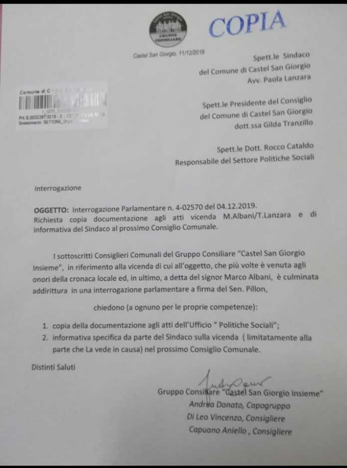 A seguito della mia Comunicazione di ieri, inviata a tutti i Consiglieri Comunali del Comune di Castel San Giorgio, inerente il presunto conflitto di interessi del Sindaco , Avv. Paola Lanzara, in quanto la stessa ricopriva anche il ruolo di Legale della controparte, quando furono interessati i Servizi Sociali, per la situazione con mio Figlio Alessandro, apprendo ora un primo riscontro. Voglio ringraziare il Gruppo Consiliare ” Castel San Giorgio Insieme” Costituito dai Consiglieri, Andrea Donato, Vincenzo Di Leo ed Aniello Capuano, per aver presentato una richiesta di chiarimento al Sindaco. Mi auguro, visto che questi argomenti non devono avere colore politico, che si aggiungano altri Consiglieri Comunali, a prescindere dalla loro collocazione in maggioranza o in opposizione.