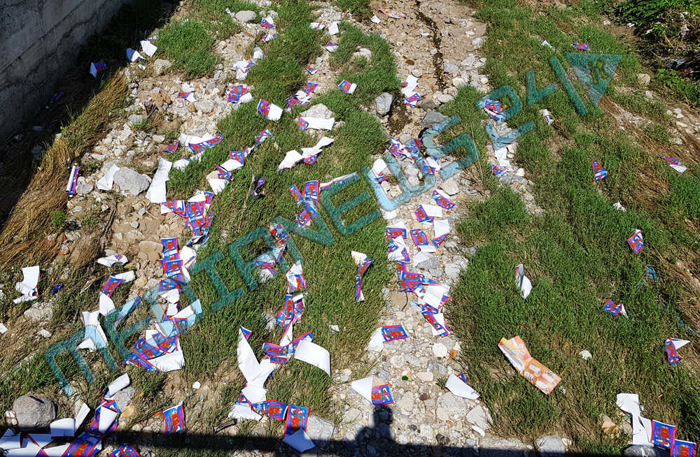 Niente di calcistico, questi colori da queste parti non sono di moda. Come non è di moda la civiltà per il personaggio che si è divertito a gettare sul letto del torrente decine di etichette di barattoli conservieri, pomodori pelati in particolare.