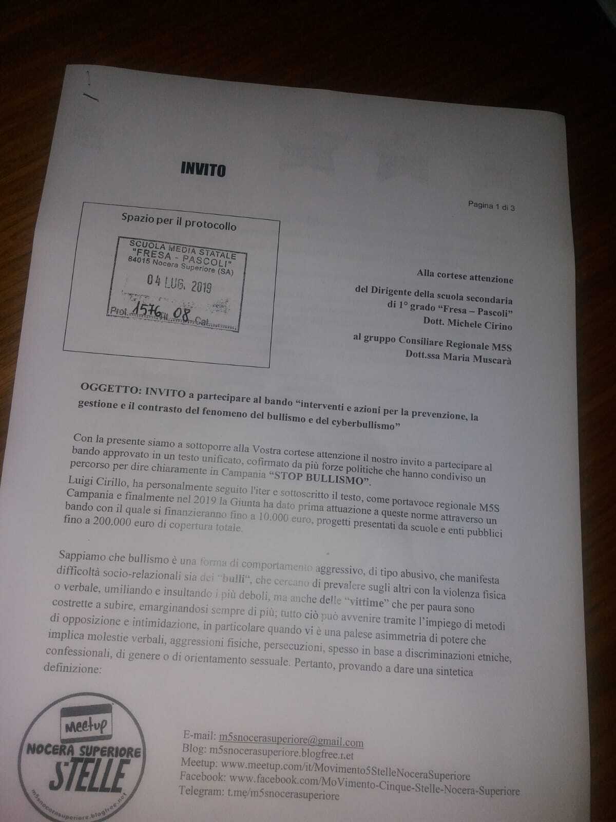 Consegnato e protocollato a tutti i circoli didattici della città l’invito a partecipare a un progetto dedicato alla grave problematica del bullismo, problematica che sta a cuore alle donne, e in generale ai genitori, quelli che fanno parte del gruppo di attivisti 5 Stelle. Un’idea nata in particolare da Grazia Apicella e Maria Teresa Giordano ma che si avvale del contributo di tutti gli attivisti del movimento che cresce in città sotto forma d’apprezzamento derivante dall’opinione pubblica, a dimostrazione che l’impegno politico può essere tale pur senza sedere in consiglio comunale.