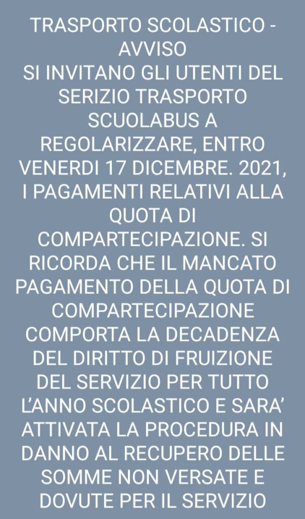 Nel merito  di quanto scritto dall’ Assessore condanniamo aspramente questa comunicazione, ricordandole che ” probabilmente ” vista la crisi economica che stiamo vivendo, alcune famiglie non hanno potuto versare ad oggi la quota per il Servizio Scuolabus.