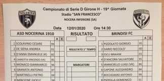 Si gioca in un acquario. I tifosi brindisi disertano, solidarietà per i nocerini colpiti da Daspo. In nome di equilibri generali, soprattutto di under, la Nocerina riparte col 3-5-2. Scolavino tra i pali. Dietro ci sono Granata, Monaco e D’Anna. Gli esterni sono De Siena e Corcione. In mezzo al campo vanno Mincione, Carrotta e Martinelli. In avanti Dieme e Liurni. Rispetto all’undici di partenza della domenica precedente, Granata al posto dello squalificato Campanella e Dieme dal primo minuto in luogo di Cristaldi. 3-5-2 anche per Ciullo.