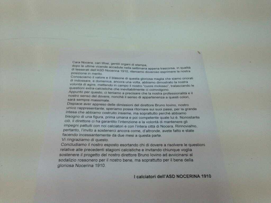 Dispiace aver appreso delle dimissioni del direttore Bruno Iovino, nostro unico rappresentante; speriamo possa ritornare sui suoi passi, per la grande intesa che abbiamo costruito insieme, ma soprattutto perché abbiamo bisogno di una figura, prima umana e poi competente quale lui è. Nonostante ciò, il direttore ci ha garantito l’intenzione e la volontà di mantenere gli impegni pattuiti con noi calciatori e con l’intera città di Nocera. Rinnoviamo, pertanto, l’invito a sostenerci ancora come, d’altronde, avete fatto e state facendo incessantemente da due mesi a questa parte.
