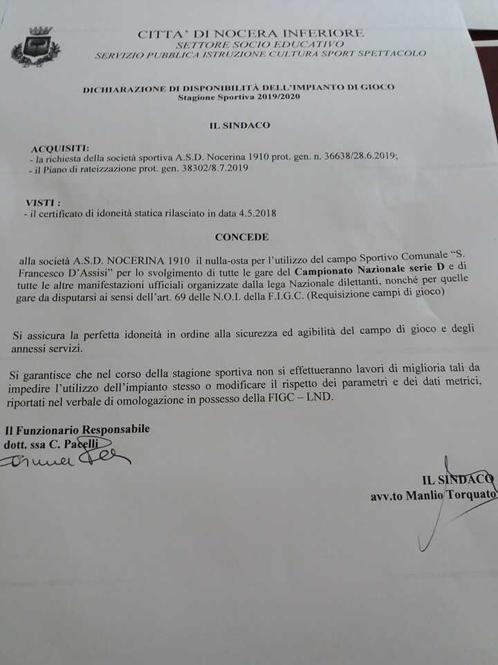 L’amministrazione comunale ha autorizzato oggi la Nocerina all’utilizzo del San Francesco. Atto indispensabile per consentire l’iscrizione al campionato nazionale di serie D.