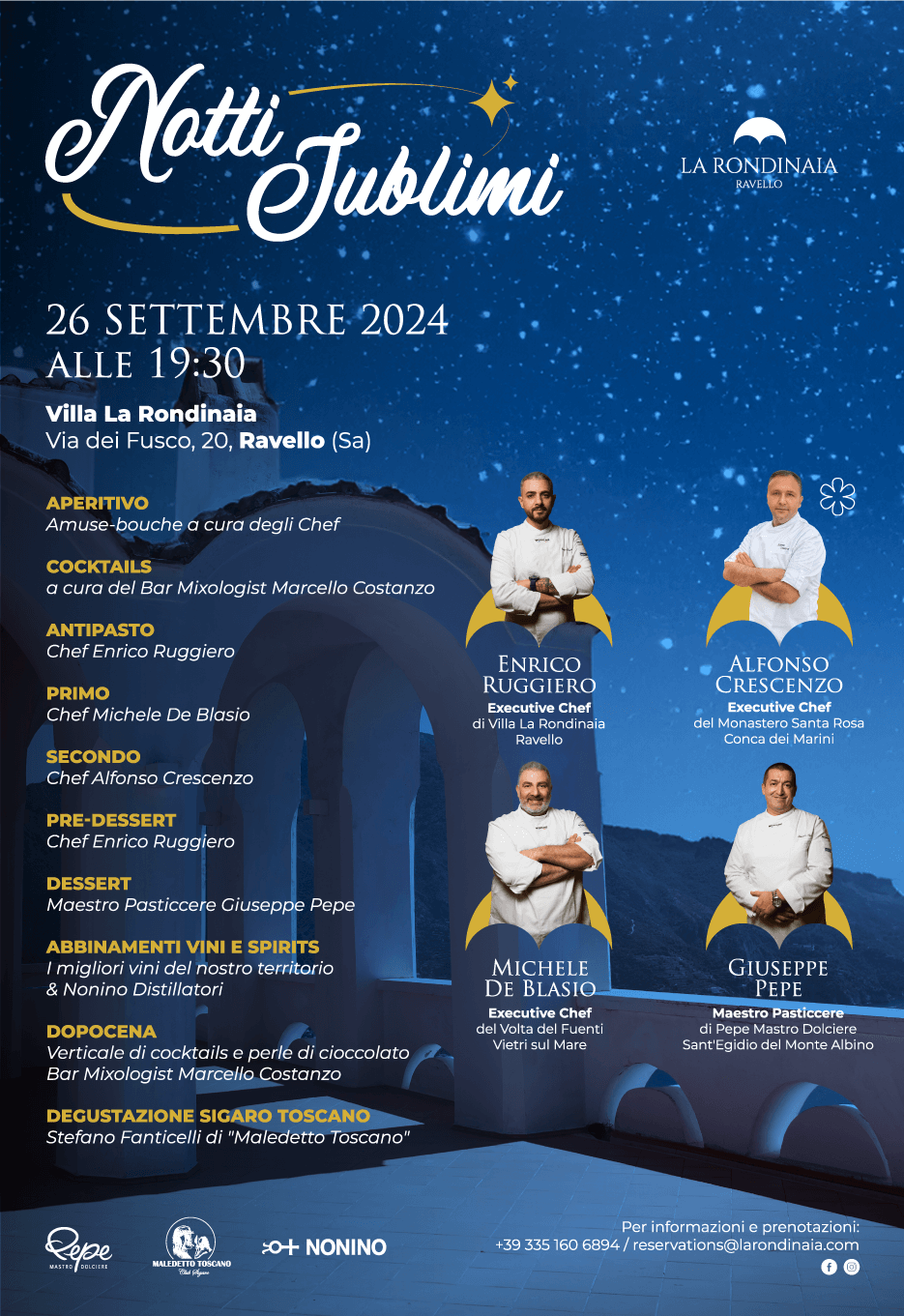La serata nasce per celebrare la bellezza, il gusto ma anche un valore come l’amicizia. Questi 4 artisti della materia gastronomica, uniti da un legame di amicizia oltre che da un profondo rispetto per la tradizione culinaria della regione Campania, saranno impegnati per realizzare precise eccellenze gastronomiche, dunque ognuno realizzerà la propria deliziosa pietanza. Il proprietario di Villa La Rondinaia, Gerardo Di Natale, racconta il motivo per il quale nasce questo evento: «Con “Notti Sublimi” abbiamo voluto creare un’esperienza che non sia solo culinaria, ma anche emozionale. Questo format rappresenta la nostra visione di ospitalità: un incontro tra eccellenza gastronomica, amicizia e la bellezza unica della nostra villa e della Costiera Amalfitana».
