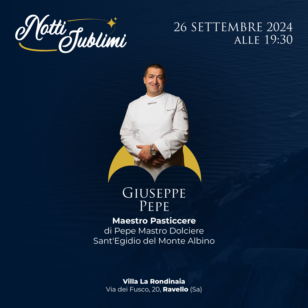 Il gran finale sarà affidato a Giuseppe Pepe, maestro pasticcere di Pepe Mastro Dolciere di Sant’Egidio del Monte Albino, il quale preparerà un dolce ispirato agli agrumi dei Monti Lattari: «Il dessert sarà un omaggio ai profumi e ai sapori della nostra terra. Ho scelto di lavorare con gli agrumi, che rappresentano l’anima stessa della Costiera Amalfitana, per chiudere la serata con una nota di freschezza, il giusto grado di acidità ed una dolcezza indimenticabile».