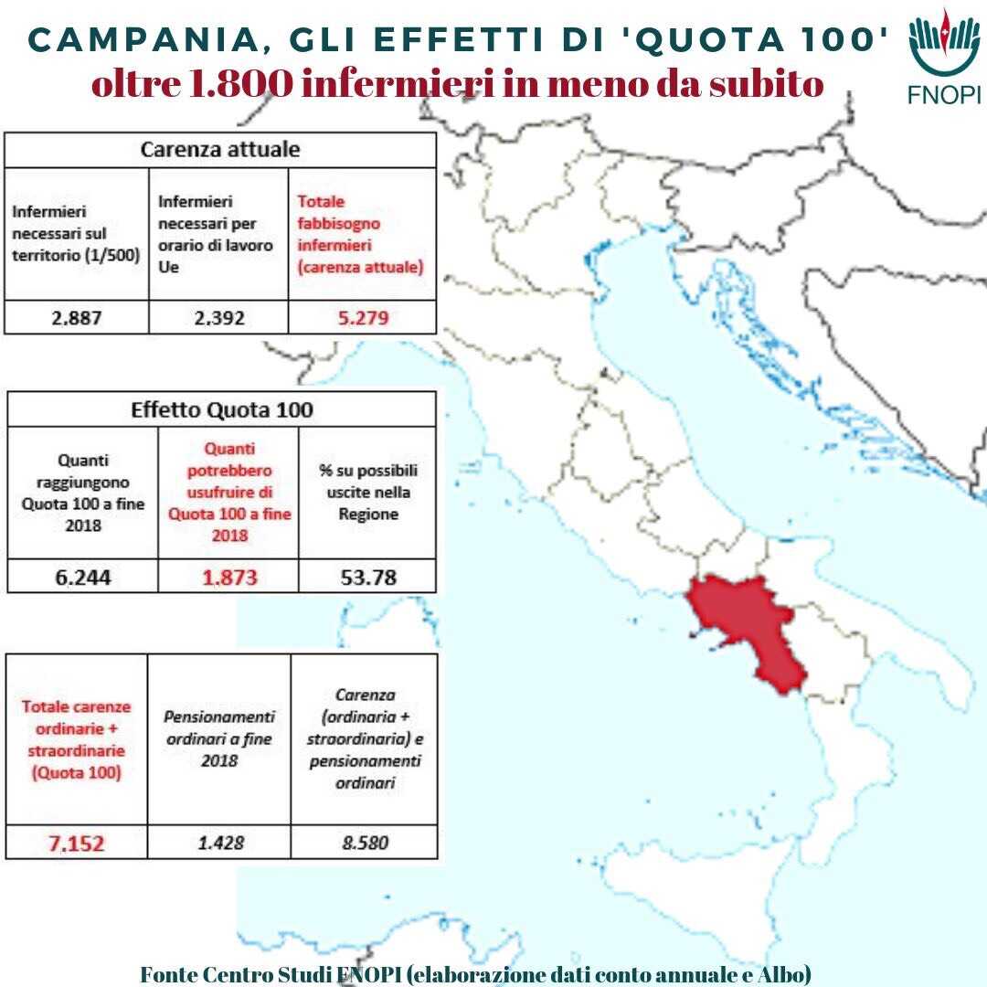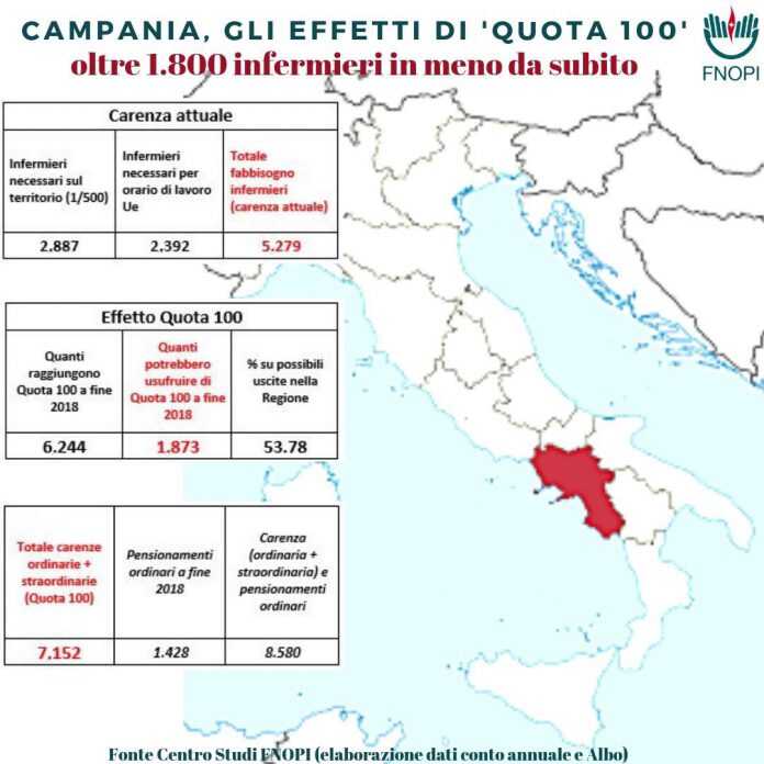 Nuovo intervento di Cosimo Cicia, Presidente Opi Salerno: “Ho lanciato da tempo un grido d’allarme circa la preoccupazione per la carenza degli infermieri e per i nuovi bisogni di salute nel salernitano. L’applicazione della c.d. “quota 100” offre la possibilità ai lavoratori, anche pubblici, che abbiano 62 anni di età e 38 anni di contribuzione di andare in pensione. I dati del “Centro Studi FNOPI” mi preoccupano e non poco circa gli effetti di “quota 100” in Campania. Dati allarmanti ! Parliamo di circa 1800 infermieri in meno da subito, ai quali bisogna aggiungere la già grave carenza di personale in cui versano i nostri ospedali. Con lo sblocco del turnover non è più accettabile una situazione del genere. Come presidente dell’O.P.I. di Salerno e membro del Comitato Centrale della FNOPI non ho dubbi nell’affermare con forza che chi esce dalla professione attiva per ‘Quota 100’ deve essere subito rimpiazzato, al di là dell’economia e della politica. Alla luce di questi dati allarmanti come Opi Salerno CHIEDIAMO un incontro urgente con i DG di AOU Salerno e Asl Salerno su come si ha intenzione di affrontare questa situazione in virtù dell’avvicinarsi delle ferie estive dove la carenza inizierà a farsi sentire ancora di più.”