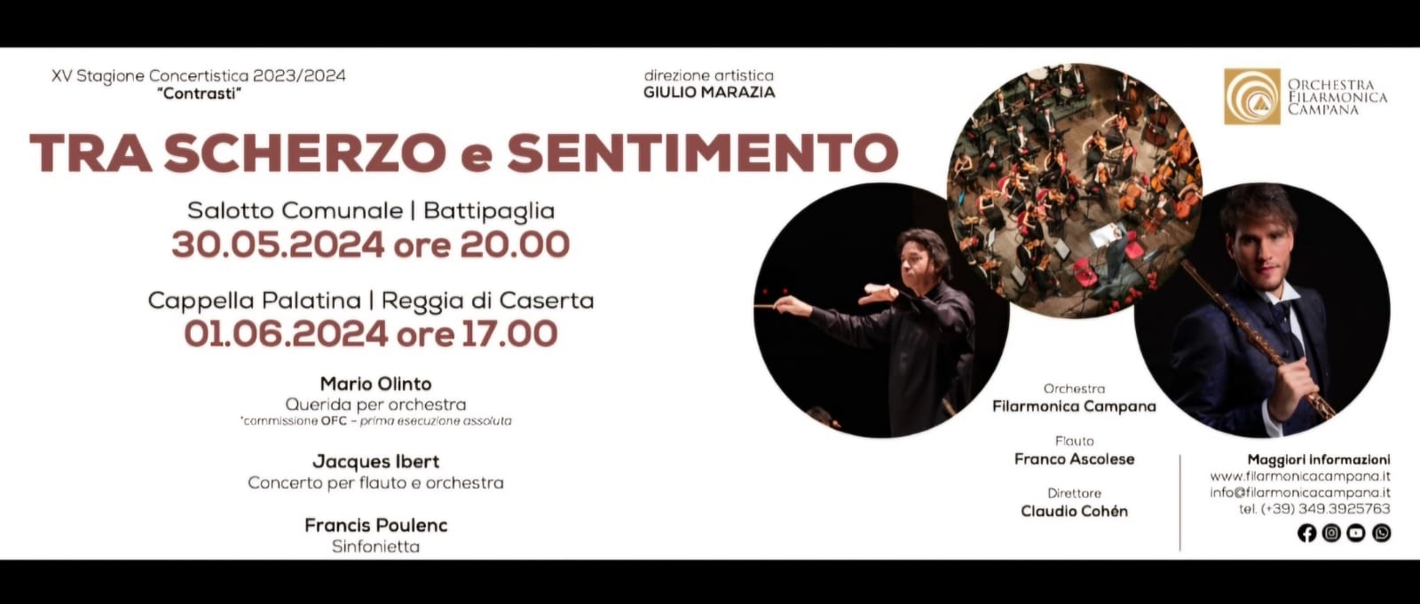 «Il Concerto “Tra scherzo e sentimento” – spiega Giulio Marazia direttore artistico e responsabile dell’Orchestra Filarmonica Campana – è un omaggio alla Francia della prima metà del Novecento. Il programma – continua Marazia – prevede musiche di Jacques Ibert e Francis Poulenc, in apertura la prima esecuzione di “Querida” di Mario Olinto, brano commissionato direttamente dall’Orchestra Filarmonica Campana, per celebrare al meglio il cinquantesimo di Comunione e Liberazione a Battipaglia-Bellizzi, occasione anche del primo concerto. Gli ideali espressi all’interno evidenziano quanto sia importante dimostrare alle persone che amiamo, sentimenti di affetto, dedizione e accoglienza. Francis Poulenc e Jacques Ibert – sottolinea Marazia – rappresentarono con le loro composizioni un esempio della volontà di rivoluzionare la musica francese dopo l’impressionismo di Debussy, influenzati dalle considerazioni estetiche del nascente futurismo e del cubismo, con un rigetto delle maestose sonorità wagneriane. Una musica tecnicamente semplice, dunque, ma supportata da un’armonia accattivante, “musica costruita a misura d’uomo” come scrisse Jean Cocteau.