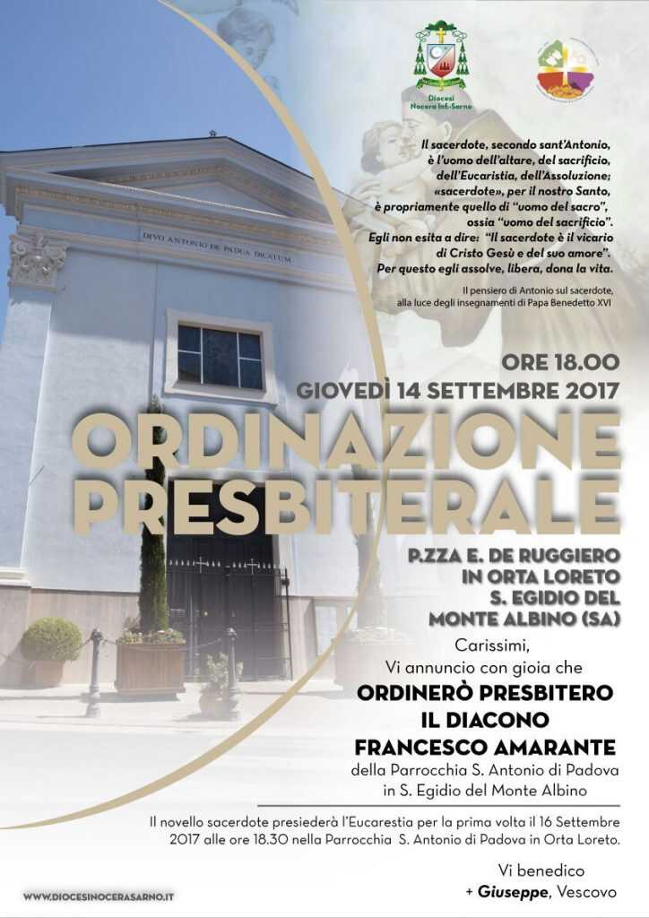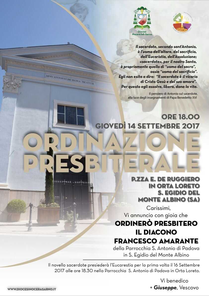 Settembre sarà un mese importante per la parrocchia di Orta Loreto, frazione di Sant’Egidio del Monte Albino, per l’ordinazione presbiterale di Francesco Amarante. Onorato e orgoglioso don Gerardo Coppola, parroco della chiesa di Sant’Antonio da Padova, guida spirituale e vero e proprio sostegno per Francesco Amarante. La cerimonia, che vedrà coinvolta tutta la frazione, si terrà il 14 settembre prossimo alle ore 18 in piazza De Ruggiero e vedrà la partecipazione di Mons. Giuseppe Giudice, vescovo della diocesi Nocera-Sarno.