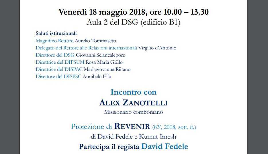Dopo la sua conferenza, che sarà seguita da una prima fase di dibattito con gli studenti, sarà proiettato “Revenir” di David Fedele e Kumut Imesh, che documenta le migrazioni dall’Africa verso l’Europa. Sarà presente il regista David Fedele, con il quale il dibattito proseguirà anche nel primo pomeriggio, nell’ambito del Corso “Asylum-Seekers Protection under Evolution/La protezione dei richiedenti asilo: sviluppi e prospettive nell’ordinamento europeo”, un Modulo di insegnamento Jean Monnet rientrante nel Programma Erasmus+, che finanzia progetti di eccellenza nell’insegnamento e nella ricerca su temi relativi al processo di integrazione europea.