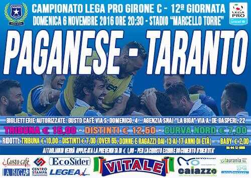 Inizia da oggi la vendita dei biglietti per la partita di domenica 6 novembre ore 20:30 tra Paganese e Taranto valida per la 12ª giornata del campionato di Lega Pro girone C.