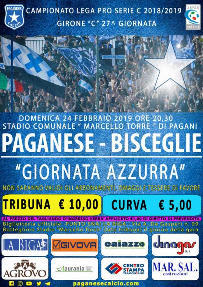 La Paganese, in occasione della gara di domenica 24 febbraio 2019, ore 20:30, contro il Bisceglie, ha indetto la Giornata Azzurrostellata. Pertanto non saranno validi gli abbonamenti, tessere C.O.N.I. – A.I.A. – F.I.G.C. e sono sospesi i biglietti omaggio a qualsiasi titolo. I tagliandi della gara sono già in vendita presso il punto vendita “SNAI La Biga” sito in via De Gasperi, 48, Pagani. La gara è di fondamentale importanza per Scarpa e compagni, l’ha confermato nel post Catania proprio mister De Sanzo.”Mi gratifica che in trasferta facciamo buone prestazioni. Il problema nostro semmai è in casa. Comunque sono contento della prestazione ed avremmo potuto raccogliere qualcosa in più. Magari fuori casa si è maggiormente liberi da un punto di vista mentale, specie se vieni in uno stadio come questo. E ti galvanizzi di più. In casa, quando dobbiamo fare la partita, abbiamo qualche problema. Ora dobbiamo tenere duro: la partita col Bisceglie sarà per noi fondamentale”. Solo riducendo lo svantaggio dal Bisceglie, infatti, la Paganese potrebbe giocarsi la salvezza ai playout, attualmente i punti di ritardo dai pugliesi sono 13 e i playout si giocherebbero solo in caso di svantaggio tra terzultima e penultima non superi gli otto punti, altrimenti la penultima retrocede direttamente in D. Oggi pomeriggio, allo stadio “Superga” di Mercato San Severino, gli azzurrostellati hanno ripreso ad allenarsi. Rientra in gruppo Scarpa, dopo il problema alla schiena che gli ha fatto saltare la trasferta di Catania. Cesaretti e Stendardo hanno svolto lavoro differenziato.