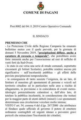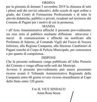 Pagani, 5 novembre con scuole chiuse