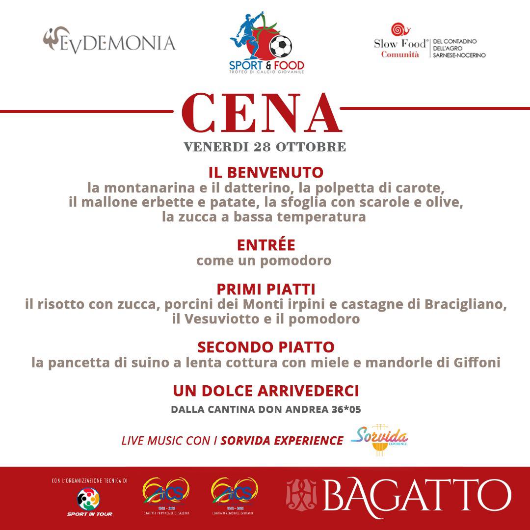 Il momento conviviale sarà preceduto dal convegno “L’alimentazione mediterranea alla base di una corretta pratica sportiva”, alle 18, presso l’Istituto Galizia di Nocera Inferiore. “Sport & Food” è la sintesi di territorio, sport, salute e ambiente.