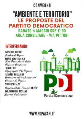 L’Appuntamento è per sabato mattina in aula consiliare. Il PD alla presenza di Fulvio Bonavitacola, vice presidente Regione Campania, discuterà in convegno di proposte concrete per il futuro di Pagani in materia di Ambiente e Territorio. Interverranno Salvatore Bottone, Giusy Toscano, Gerardo Palladino, Vincenzo Calce e Marcello Toscano.