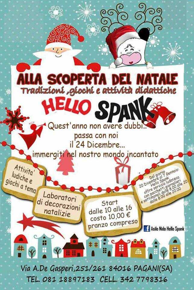 “Natale per noi è magia – ha detto la titolare della Hello Spank – e cercheremo di ricreare un clima fiabesco per divertire al meglio i nostri bambini. Queste sono iniziative che curiamo in genere con i bambini del nostro asilo, ma ci fa piacere se vengono altri bimbi dall’esterno. La giornata è organizzata dai miei animatori, con i quali ci catapulteremo in un vero e proprio “Villaggio di Babbo Natale”. Arriveranno le slitte, chiederemo ai bambini di scrivere la letterina, giocheremo ripercorrendo un po’ le tradizioni dei nostri genitori. Ci sarà anche una tombolata. Tutto avverrà nella nostra struttura – ha detto ancora Virginia Granato – se il tempo lo permette daremo vita a numerose attrazioni all’esterno altrimenti ci attrezzeremo all’interno. Abbiamo locali che ci consentono la possibilità di avere spazi ampi che possono accogliere numerosi bambini. Inizieremo alle 10.00 e andremo avanti fino alle 13.00, pranzo incluso. Vi aspettiamo”