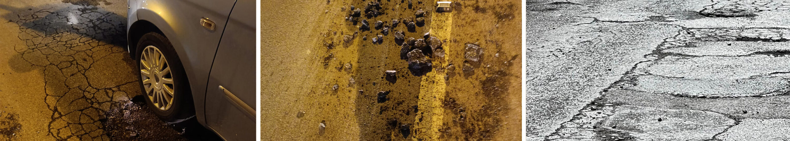 Quando le strade che devi percorrere ogni giorno sembrano essere stata bombardate finisci per prenderla, la testimonianza di alcuni cittadini attraverso il social, oltre le segnalazioni in redazioni, è un susseguirsi da parte di cittadini e automobilisti, esasperati per le pessime condizioni in cui versano le strade, disseminate di piccole e grandi buche (quando va bene), ma anche di vere e proprie voragini e cedimenti del terreno, enormi e pericolose: impossibile riuscire ad evitarle tutte, anche camminando a passo d’uomo.