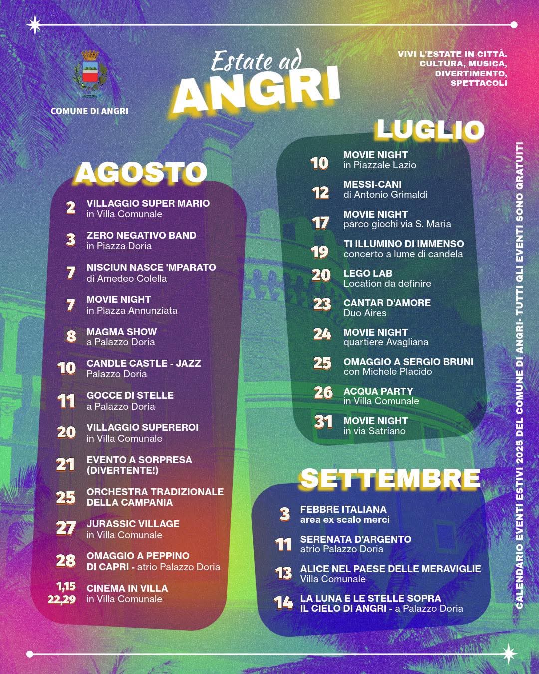 Pubblicato il 16 luglio il cartellone estivo del Comune di Pagani. Peccato che molti eventi, come chiaramente indicato nel programma, siano già andati in scena: si parte addirittura dal 30 giugno. Un tempismo imbarazzante, che restituisce l’immagine di un’estate improvvisata, senza visione, senza regia. Altro che promozione turistica o rilancio culturale.Leggendo il documento ufficiale, il dubbio sorge spontaneo: più che un cartellone istituzionale, sembra la locandina dell’associazione commercianti Ama, che infatti compare come soggetto protagonista in gran parte delle iniziative, salvo l’eccezione delle celebrazioni dedicate al Santo patrono acquisito, Sant’Alfonso Maria de’ Liguori.