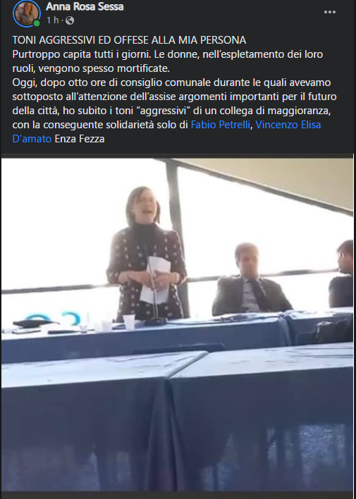 Ecco il post della consigliera Sessa: oggi, dopo otto ore di consiglio comunale durante le quali avevamo sottoposto all’attenzione dell’assise argomenti importanti per il futuro della città, ho subito i toni “aggressivi” di un collega di maggioranza, con la conseguente solidarietà solo di Fabio Petrelli, Vincenzo Elisa D’Amato ePagani. Consiglio comunale da toni aggressivi: la nota del Consigliere Anna Rosa Sessa Enza Fezza.