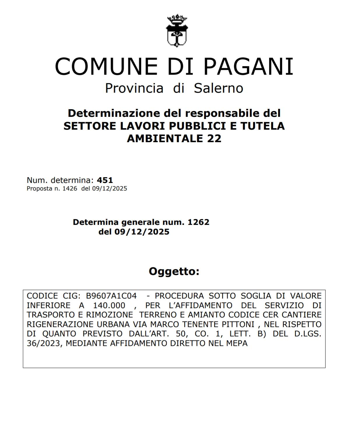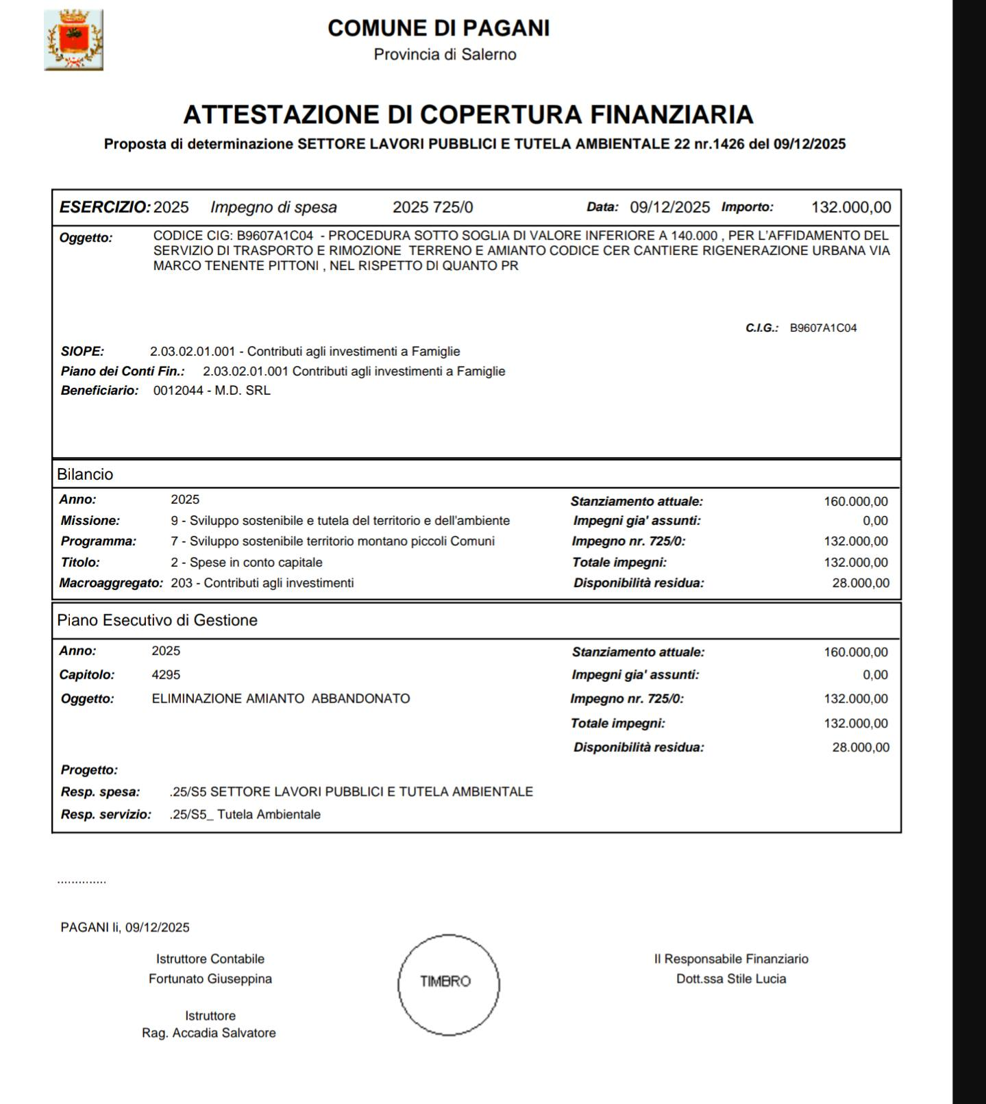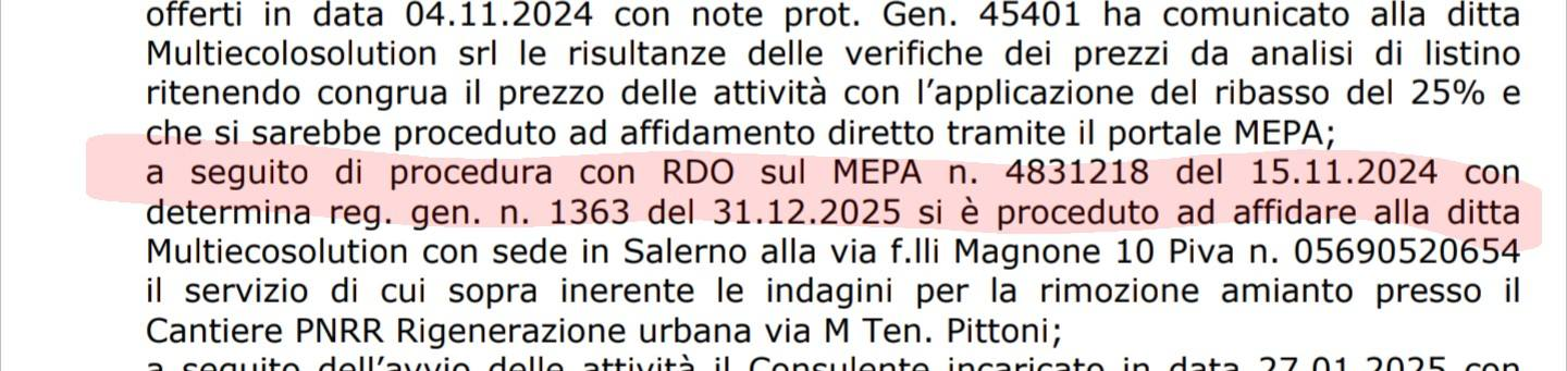 La determina per l’affidamento del servizio di trasporto e rimozione del terreno e dell’amianto risulta infatti pubblicata solo in data 9 dicembre 2025, nell’ambito di una procedura sotto soglia di valore inferiore ai 140mila euro.