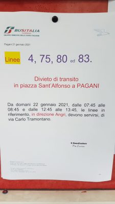 Da domani, venerdì 22 gennaio 2021, dalle 07:45 alle 08:45 e dalle 12:45 alle 13:45, le linee 4, 75, 80, in direzione Angri, non transiteranno in piazza Sant’Alfonso.