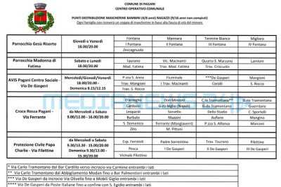 Il Comune di Pagani ha ricevuto dalla Regione Campania le mascherine per bambini e ragazzi che, a partire da mercoledì 20 maggio, saranno distribuite attraverso il supporto prezioso delle Parrocchie, di Croce Rossa Pagani, AVIS Comunale Pagani e Protezione Civile Papa Charlie.