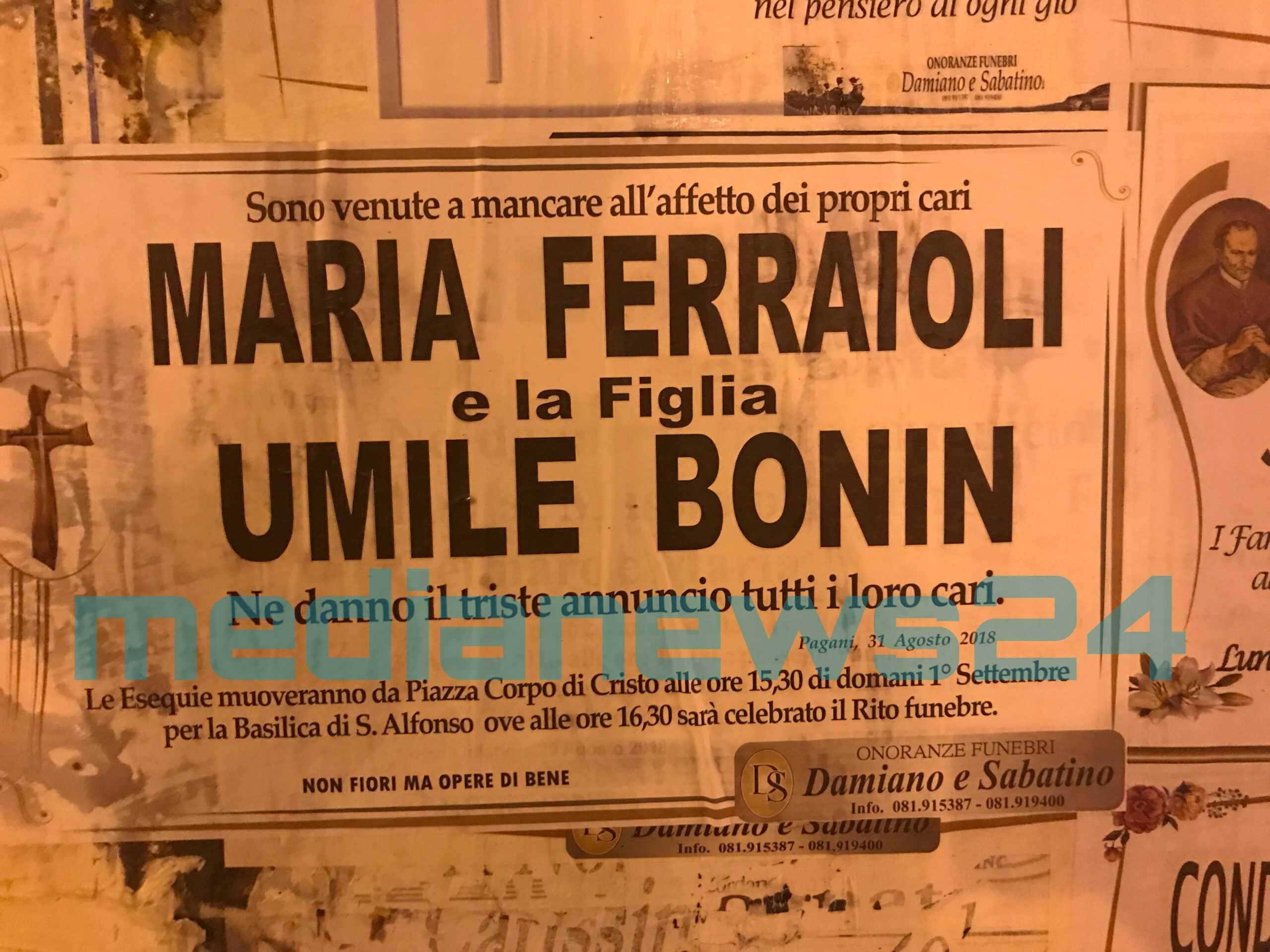 La città di Pagani si prepara a rendere l’ultimo saluto a Maria e Mila. Si terranno infatti domani pomeriggio le esequie di Maria Ferraioli e Umile Bonin, madre e figlia morte giovedì mattina nel cuore del centro storico cittadino.