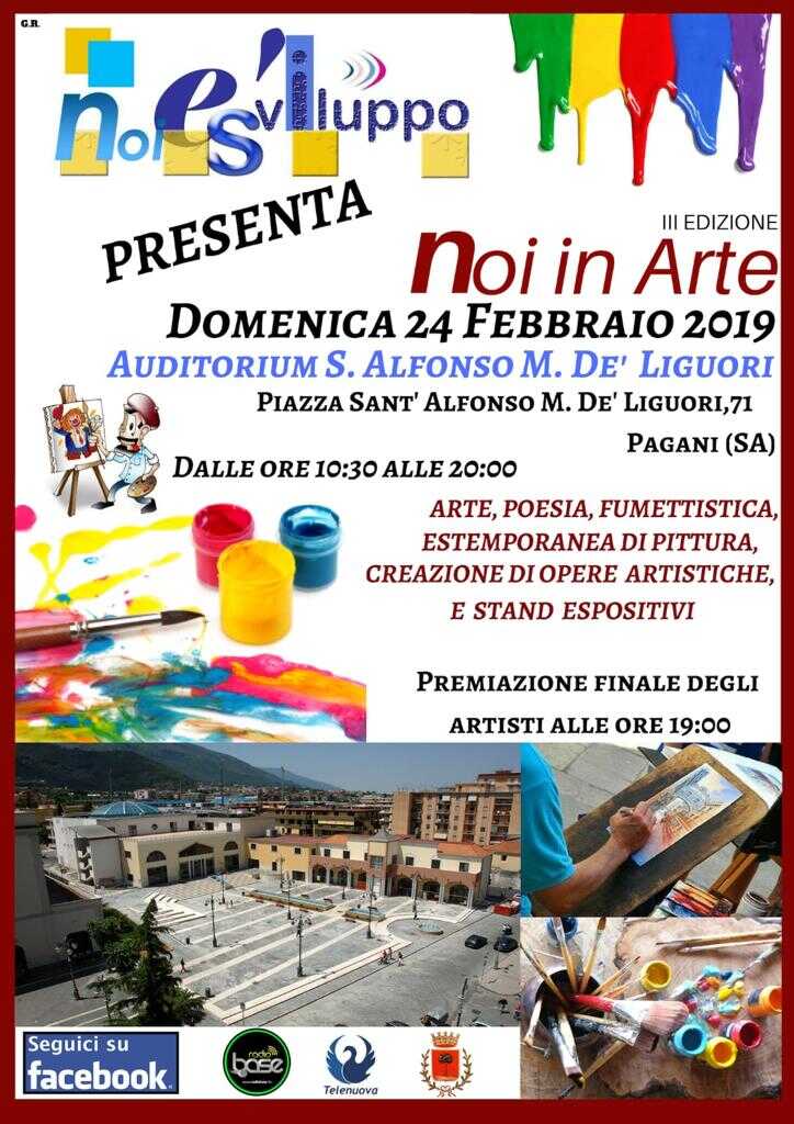 Arte, poesia, fumettistica,estemporanea di pittura, creazione di opere artistiche e stand espositivi. Tutto questo e altro ancora è “Noi in arte”, la Kermesse organizzata dall’associazione ‘Noi è sviluppo”, giunta alla sua terza edizione, che si terrà domenica 24 febbraio dalle ore 10.30 alle ore 20.30, con premiazione finale degli artisti, all’auditorium di Pagani. ” vi aspettiamo tutti- ha dichiarato il Presidente Giuseppe Baccaro- Viviamo insieme questo appuntamento all’insegna dell’arte e della socialità”