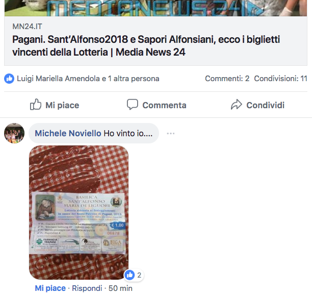 È Michele Noviello il vincitore della Crociera Costa Fascinosa messa in palio dalla Lotteria di Sant’Alfonso. L’uomo, dipendente comunale molto noto in città, ha dichiarato di essere il possessore del biglietto vincente della Lotteria postando sui social, nei commenti al nostro articolo di richiamo, la fotografia del tagliando in questione. Una notizia, questa, che sta facendo il giro della città di Pagani.