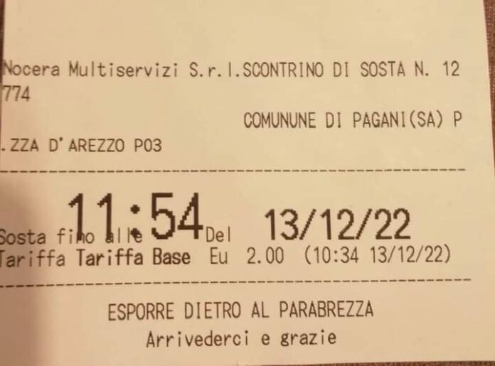 Questo è il ticket che rilasciano i parcometri situati nel Comune di Pagani. Come si può vedere, in alto a sinistra vi è la scritta “Nocera Multiservizi srl”. La gestione dei parcheggi e delle aree di sosta comunali, dunque, è diventata della Nocera Multiservizi? La Sam è stata forse esautorata? Chiedo per sapere, considerato che per il Consiglio Comunale non è passato alcun atto.