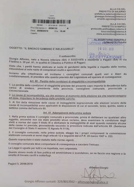 Il sottoscritto: Giorgio Alfonso, nato a Nocera Inferiore (SA) il 03/03/1978 e residente a Pagani (SA) in via Filettine n. 35 pal. A1, in qualità di Cittadino e Politico di Pagani: Visto che, i partiti hanno abdicato al ruolo di gendarmi della legalità e rispetto delle norme, riducendosi al solo ruolo di comprimari inutili e spocchiosi. Inviamo alla cittadinanza ed invitiamo i consiglieri comunali quelli veri e liberi da condizionamenti, di prendere atto quanto previsto dal Legislatore ed operare di conseguenza: Art. 68 – Perdita delle condizioni di eleggibilità e incompatibilità