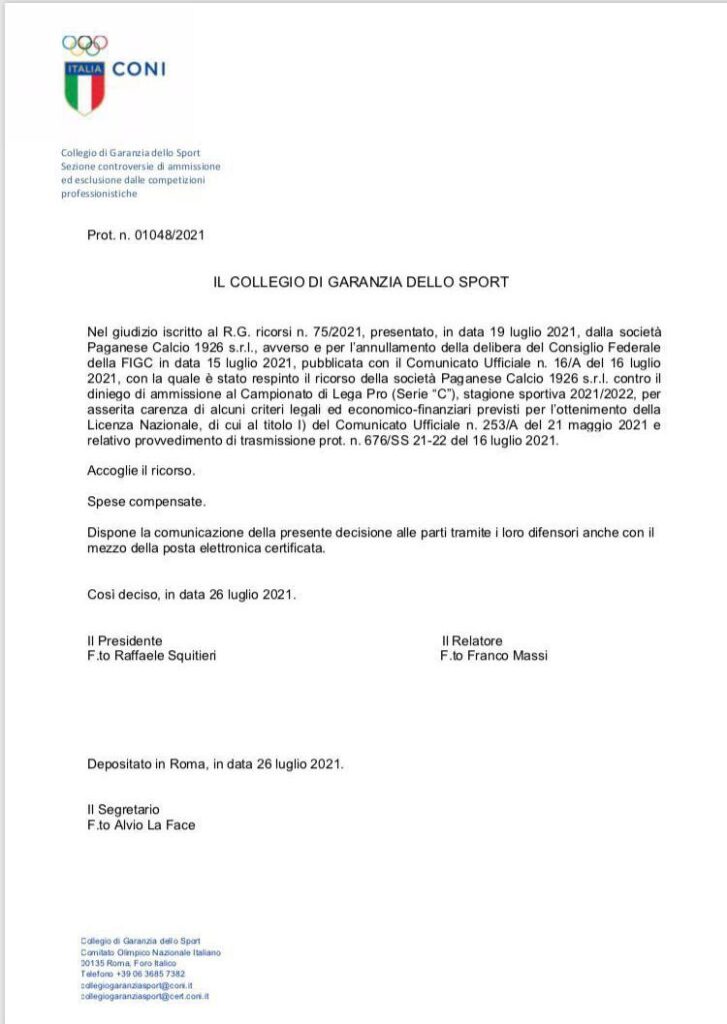 Il CONI, insomma, ha dato ragione alla Covisoc su quasi tutta la linea, dandole torto solamente sulla Paganese. Per i campani è il secondo salvataggio in extremis della stagione, dopo quello al minuto 97 dei playout contro il Bisceglie. Ed è anche il secondo salvataggio estivo: cinque anni fa il club di Pagani riuscì a rientrare in Lega Pro, dopo un’iniziale esclusione, grazie alla decisione del TAR del Lazio.