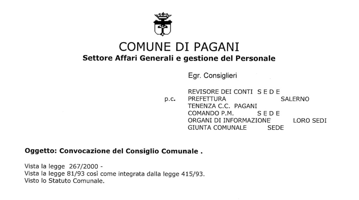 Il consiglio Ccmunale di Pagani è stato ufficialmente convocato in seduta ordinaria per venerdì 4 luglio 2025 alle ore 18, con eventuale seconda convocazione prevista per lunedì 7 luglio alle ore 19. La riunione si terrà presso la sala polifunzionale dell’Auditorium comunale, nell’aula Consiliare “Marcello Torre” e nella pinacoteca “Tommaso Fusco”.