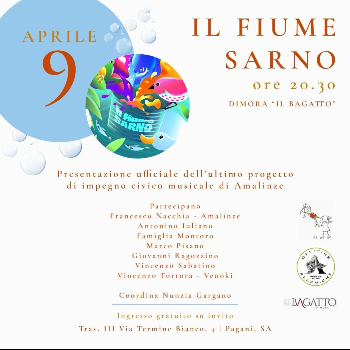 Mercoledì 9 aprile, alle 20:30, presso la Dimora Bagatto in via Termine Bianco a Pagani, si terrà la prima presentazione ufficiale del brano e del video del nuovo lavoro di impegno civico di Amalinze, intitolato Il fiume Sarno.