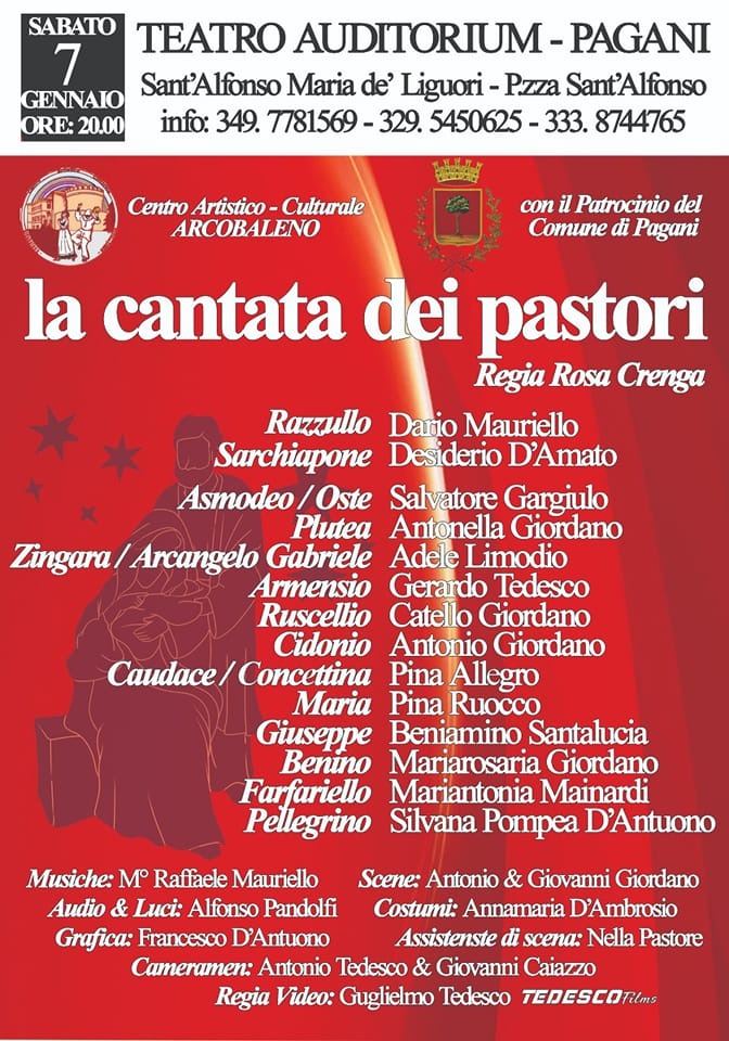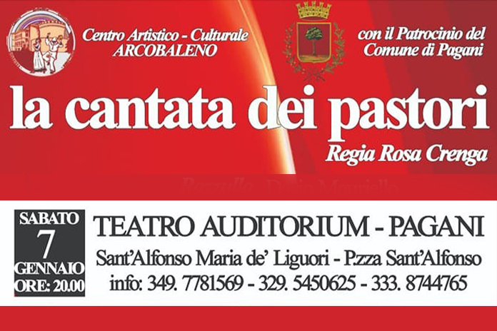 Il 7 gennaio 2023 il Centro Artistico Culturale Arcobaleno metterà in scena presso l’Auditorium di Pagani “La Cantata dei Pastori”, notissima opera del teatro religioso tardo-seicentesco.