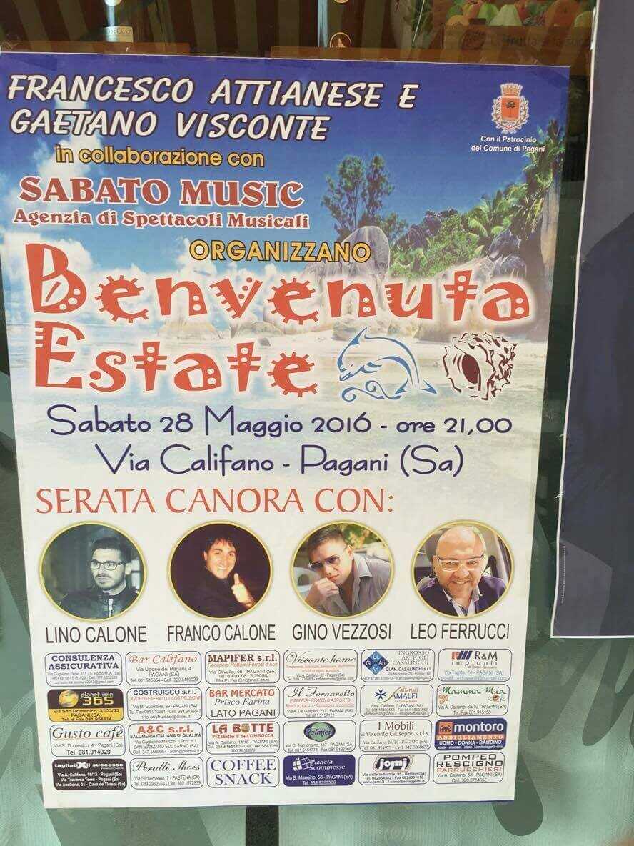 Tutto pronto, a Pagani, per ”Benvenuta Estate”, organizzato da Francesco Attianese e Gaetano Visconte in collaborazione con l’Agenzia di spettacoli musicali ”Sabato Music”. L’ iniziativa, che andra’ in scena stasera alle ore 21 a Via Califano, a Pagani, vedra’ l’ esibizione di artisti napoletani neomelodici e piu’ veterani quali Lino Calone, Franco Calone, Gino Vezzosi e Leo Ferrucci. Una serata canora ed un momento di festa, quello per la comunita’ liguorina, patrocinato dall’ Amministrazione comunale e supportato da ”Progetto Lavoro” societa’ cooperativa di servizi operante sul territorio paganese attiva e sensibile all’ avvio di soggetti disagiati nel mondo del lavoro. Notevole l’ impegno delle altre attivita’ commerciali ed aziende del territorio per la realizzazione della serata. Fermento ed entusuasmo in citta’ per il ”via” alla manifestazione.