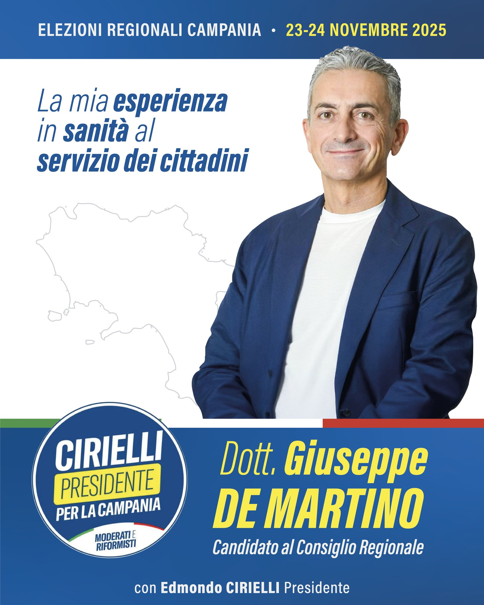 Il dottor Giuseppe De Martino, cardiologo, aritmologo ed elettrofisiologo interventista, responsabile di diversi centri di aritmologia, è candidato al consiglio regionale della Campania nella lista Cirielli Presidente per la Campania. Questa mattina, alle ore 12, ha tenuto un incontro politico all’Auditorium Sant’Alfonso Maria de Liguori di Pagani, la sua città natale.