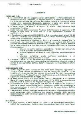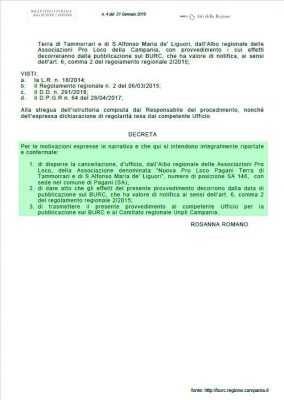 Amara sorpresa per una realtà associative paganese. Con decreto dirigenziale della Regione Campania dello scorso mese di gennaio, è stato cancellata dall’albo regionale delle Pro Loco l’associazione “Nuova Pro Loco Pagani Terra di Tamorrari e di Sant’Alfonso Maria de’Liguori”. Secondo i funzionari della regione, l’associazione in questione non avrebbe prodotto nei termini prevista la necessaria documentazione, prevista dalle norme, per gli anni 2017 e 2018. La cancellazione ha un effetto ben preciso, ovvero l’impossibilità di ricevere contributi regionali assieme all’impossibilità di partecipare a bandi. Resta solo da valutare se esistono gli estremi per impugnare il provvedimento e presentare, sia pure in ritardo, la documentazione occorrente.