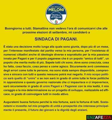 “Sarò sicuramente in grado di unire Pagani e i Paganesi con la mia lealtà, il mio coraggio e la mia determinazione su un progetto di sviluppo, realizzabile ed efficace – racconta la candidata – in grado di coinvolgere tutti in modo attivo”.