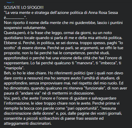 Sessa, questa mattina ha pubblicato nella sua pagina social, la risposta, una risposta che la rappresenta, più evidente e più forte della violenza verbale di chicchessia usata nei confronti di una donna, che è prima che consigliere, e dunque rappresentante delle istituzioni, una donna che si è messa in gioco.