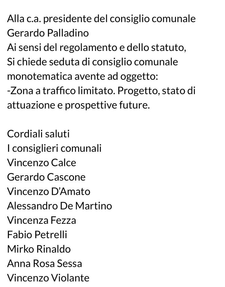 E’ stata protocollata stamane, all’attenzione del Presidente del Consiglio Comunale Gerardo Palladino, la richiesta, da parte dell’opposizione cittadina, di una seduta di consiglio comunale monotematica sul progetto ZTL, partito in via sperimentale da qualche settimana nel comune di Pagani.