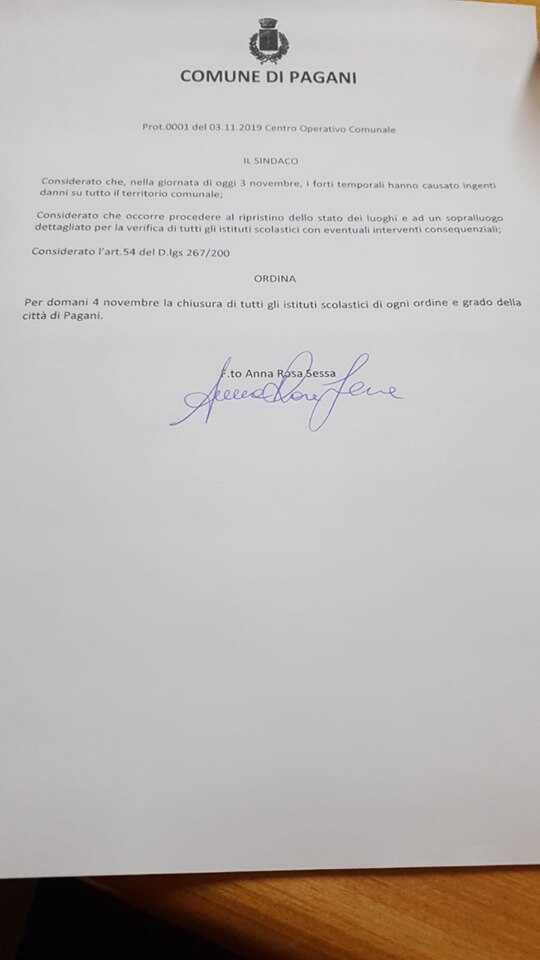 Bisogna provvedere necessariamente a sopralluoghi per stabilire l’entità dei danni eventualmente riportati dagli edifici scolastici cittadini. Per tale motivo, domani scuole chiuse. La comunicazione è arrivata dall’amministrazione comunale. Analogo provvedimento preso dai comuni da Nocera Inferiore, Castel San Giorgio, Roccapiemonte, Siano e Sarno. Aperte, invece, a Scafati e Nocera Superiore oltre che a Sant’Antonio Abate.