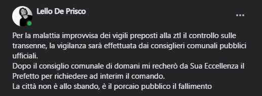 Ecco il post denuncia di oggi pubblicato dal sindaco Lello De Prisco sul suo profilo personale, sono parole dure: insieme ai consiglieri a sopperire alle carenze di organico determinate dalle assenze per malattia dei caschi bianchi.