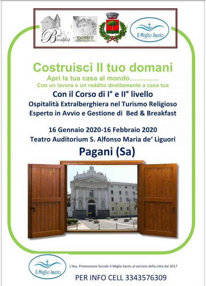 Si concluderà con un notevole successo e presenza di partecipanti domenica 16 febbraio 2020 alle 11.00 con la presenza del Sindaco F.F. Annarosa Sessa, il Prof. Raffaele Palumbo, Il Prof. Aniello Ascolese e il Dott. Marco De Pascale nell’Auditorium S.Alfonso Maria de Liguori a Pagani la Seconda Edizione del Corso organizzato dall’Associazione “il Miglio Santo”, il Dipartimento di Studi di Ricerche Turistiche e Sviluppo Territoriale e il Patrocinio gratuito del Comune di Pagani per la consegna dei titoli di Esperti in Creazione di Bed&Breakfast e si invita la cittadinanza tutta e tutte le associazioni di Pagani a partecipare. Questa seconda edizione raccoglie già i risultati della prima edizione che ha permesso a molti paganesi di aprire dei Bed&Breakfast a Pagani che hanno ricevuto delle ottime recensioni dalle principali piattaforme sulla rete che ha confermato la qualità e la professionalità del corso svolto. Questo è solo una delle tante iniziative promosse dell’Associazione Il Miglio Santo e alla fine della manifestazione saranno annunciate le prossime iniziative.